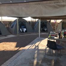 The Kalahari Info Centre and Tented Camp provides visitors to the Kalahari with a camp that has fully equipped tents, complete with beds, bedding and electricity. On offer are 16 twin-bed tents, four single-bed tents and four double-bed tents with ablution facilities. There are also five double-bed chalets – each with a television, air-conditioner, refrigerator, shower and toilet – as well as open braai areas. The on-site conference room can seat up to 80 people, with catering included.