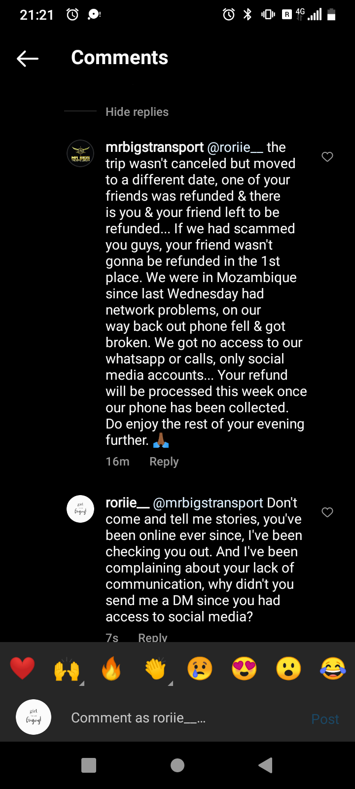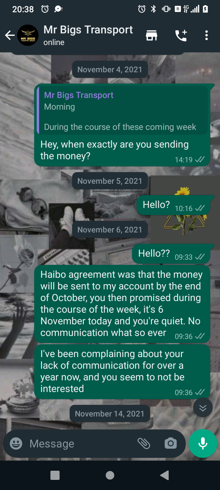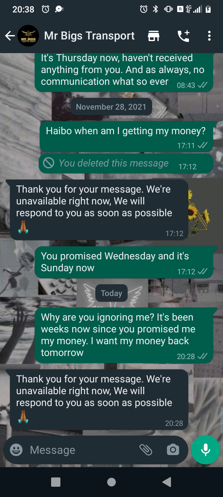 Mr Bigs Transport Service is very unprofessional and arrogant. I paid for a trip of two from Polokwane to Pretoria in full, he was running late and not communicating he ended up not coming at all and said he was gonna refund my money which was R700.